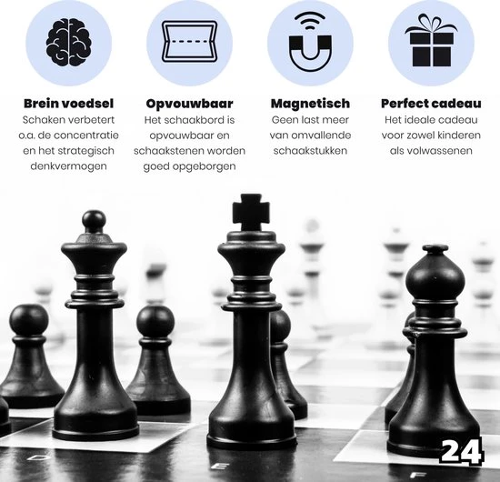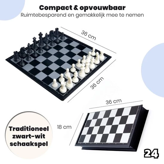 Schaken kun je nu altijd en overal. Binnen, buiten, thuis, in het park of op reis. Met deze handige magnetische en opklapbare schaakset vallen de schaakstukken niet meer van het bord en hou je alle schaakstukken opgeborgen in het schaakbord. Ben je een beginnende, herintredende of gevorderde speler? Het maakt niet uit, iedereen kan met dit schaakspel een uitdagend en (ont)spannend potje schaak spelen.