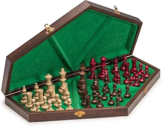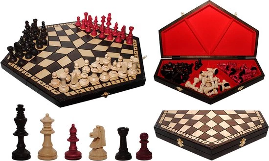 Dit schaakset voor 3 spelers is erg handig door het grote formaat van deze set. Het inklapbare schaakset is verkrijgbaar in standaard (bruine) kleur. De schaakstukken zijn gemaakt van haagbeuk en beukenhout en hebben een zwarte vilten aan de onderkant om beschadigen van het schaakbord te verkomen. Aan elke set is een folder met de regels van het spel toegevoegd. Het schaakbord heeft drie compartimenten afgewerkt met viltvoering voor de opslag van schaakstukken binnenin. Het schaakset is voorzien van een mooi afgewerkte zeshoekige schaakbord dat is voorzien van met vilt beklede vakken voor het opbergen van de schaakstukken.