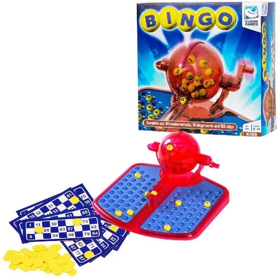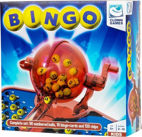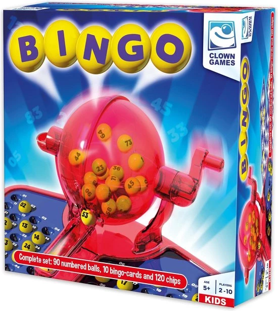Wie roept er als eerste BINGO? Speel dit gezellige spel met jouw vrienden of familie. Met deze complete set van Clown Games heb je alles in huis! Je kunt de kaarten steeds opnieuw gebruiken, omdat je de getallen op je kaart bijhoudt met een fiche. Spannend: heb jij het snelst een rij vol, of misschien wel de hele bingokaart? Inhoud: bingomolen, controlebord, 90 genummerde ballen, 10 bingokaarten en 120 fiches. Wordt geleverd in full-colour doos. Geschikt voor 2 tot 10 spelers vanaf 5 jaar.