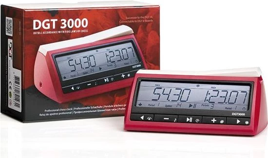Schaakklok DGT 3000. Deze schaakklok heeft de volgende opties: TIME, Guillotine, Bronstein delay, Fischer, GO, Scrabble, Internet, Zandloper. 18mm cijferdisplay. Offici?le FIDE klok. Afmetingen: 155x115x65mm.