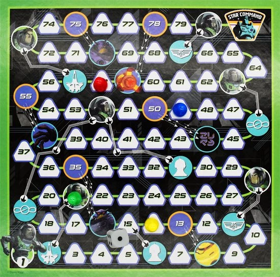 Zin een bordspel maar je kan niet goed kiezen? Geen probleem in deze doos zitten 4 verschillende spelborden en verschillende dobbelstenen zodat je elke dag een ander spel kan spelen. De vier spelborden bestaan uit Slangen en Ladders, molenspel, dammen en een ludo (mens-erger-je-niet). Lightyear en zijn vrienden maken het spelplezier alleen maar groter.
