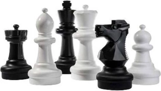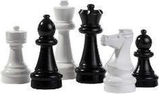 Schaakspel, zwart/wit van waterafstotend kunststof. Hoogte koning 31 cm.