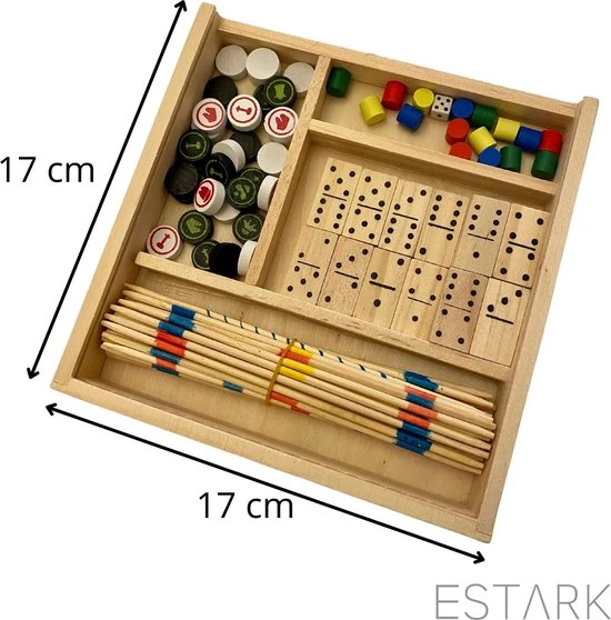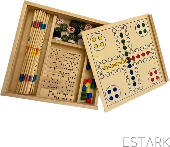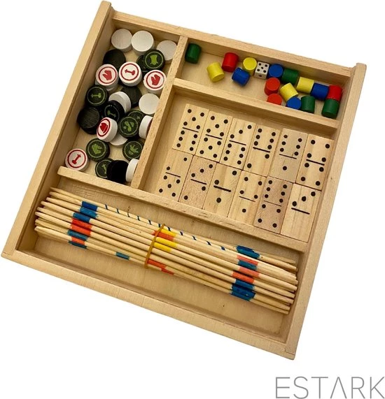 ESTARK? Games Spellenset – Gezelschapsspel – Hout 5 in 1 – Spel – Spelletjes – Houten Spelen Geen batterijen – Denkspel – Bordspel – Ludo – Schaakspel – Schaakbord – Domino – Dobbelstenen – Mikado Set – Speeldoos Hout