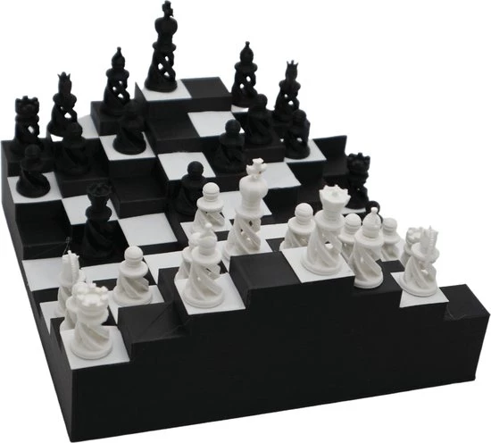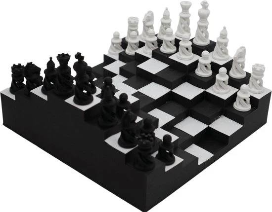 Het schaakbord met een uniek design. De vakken van het schaakbord zijn verdeeld in verschillende hoogtes, hierbij is een luxe & uniek schaakbord ontstaan. De schaakstukken zijn uniek ontworpen met een spiraal design. Materialen : gemaakt van gerecycled plastic. (duurzaam) Gemaakt in Nederland.