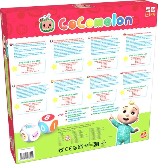 Gooi met de extra grote dobbelstenen om te zen naar welke combinatie van letter en dier je op je bingokaart moet zoeken. Heb je een olifant in de kolom ‘B’? Dan mag je dat vakje met een fiche afdekken. Als je geluk hebt en je de joker in de vorm van het CoComelon-logo gooit, mag je het vakje met dat dier afdekken, in welke kolom het zich ook maar bevindt. De eerste speler die vijf vakjes op een rij met fiches afdekt wint!