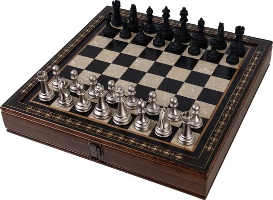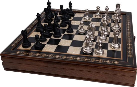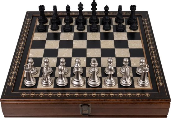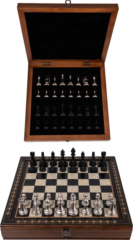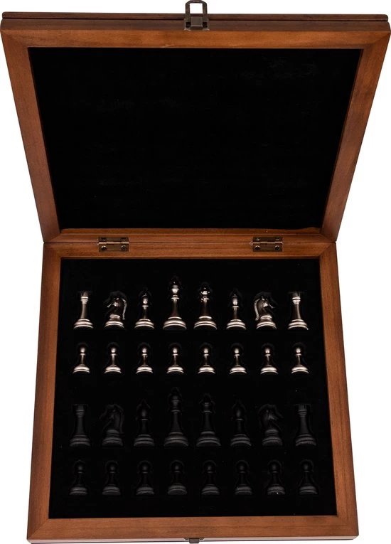 Dit handgemaakte schaakspel is gemaakt van beukenhout en beschikt over mooie, natuurlijke kleuren van verschillende houtsoorten. De metalen schaakstukken maken dit schaakset stijlvol en compleet. Het schaakbord bevat een handige opbergruimte waarin de schaakstukken netjes opgeborgen kunnen worden. Naast de opbergruimte komt deze luxe schaakset ook met een draagtas zodat je gemakkelijk overal kan een potje kan schaken.