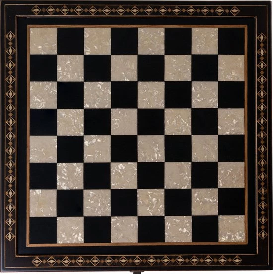 Het bord is gemaakt van duurzaam beukenhout waarvan de vierkanten zijn ingelegd met ebbenfineer en parelmoer.