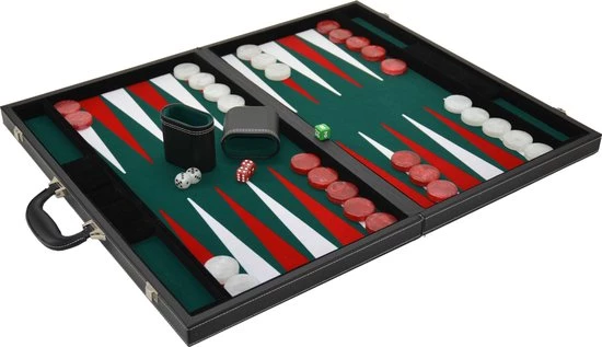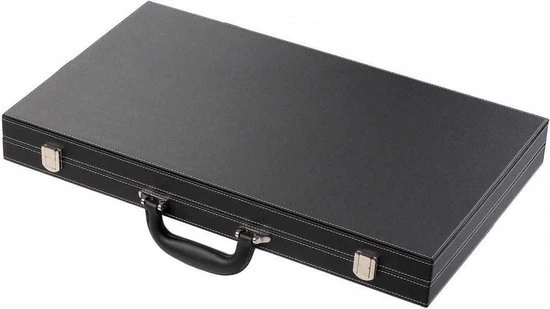 Backgammon.zwart de Luxe, glad speelveld. Zwarte kunstlederen koffer, met wit stiksel. Groen velours met rode en witte ingelegde punten 34 mm. Maat 46 x 30 cm. Open 46 x 60 cm..