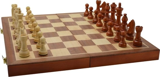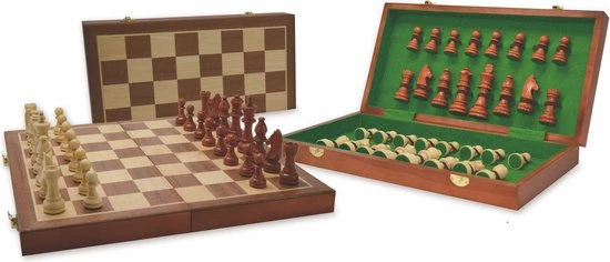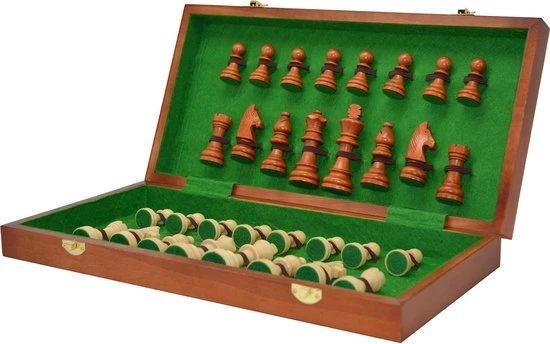 Met houten schaakstukken, Koningshoogte 89 mm.