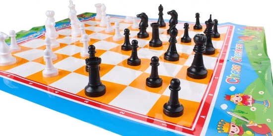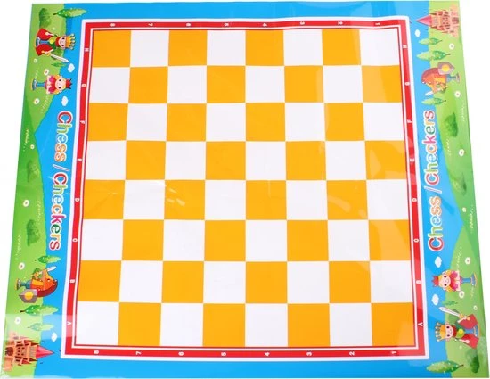Wie kan als eerste een schaakmat op de tegenspeler zijn koning zetten? Het bord is gemaakt van zeil waardoor je hem eenvoudig op kunt vouwen en op kunt bergen.