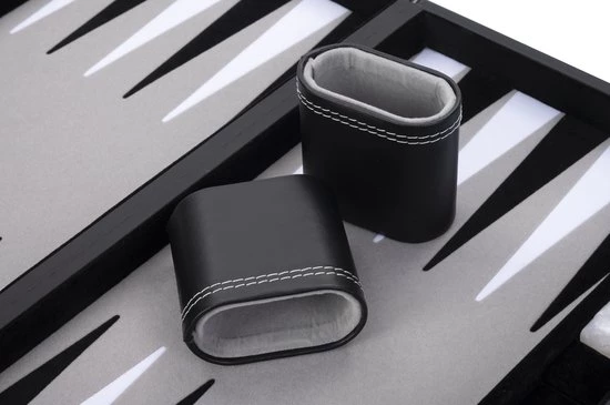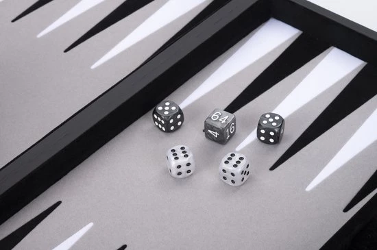 Longfield Backgammon 15″ inch zwart wit en grijs ingelegd vilt in leren koffer.