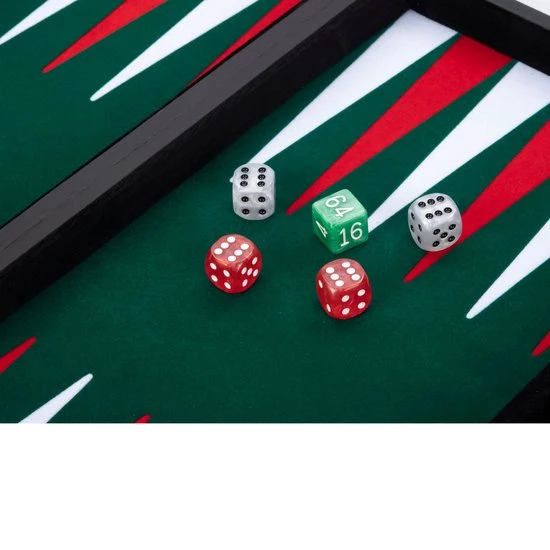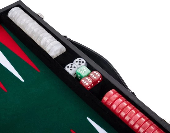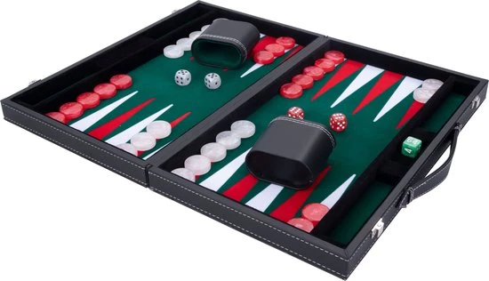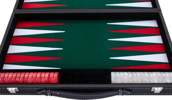Backgammon 18″, groen/rood/wit ingelegd vilt. In luxe zwarte kunstlederen koffer.