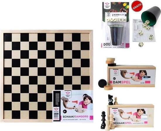 Longfield Games Compleet dambord/schaakbord met schaakstukken en damstenen. Aan de ene kant een dambord en aan de andere kant een schaakbord. Het bord heeft een afmeting van 40 x 40cm en is inclusief houten damstenen en schaakstukken. De damstenen en schaakstukken zitten verpakt in een handig opbergdoosje. U ontvangt 20 zwarte en 20 witte damstenen. U ontvangt 16 zwarte en 16 witte schaakstukken.