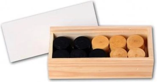 Damstenen van zwart en blank beukenhout in een kistje met schuifdeksel. 20 damstenen per kleur.