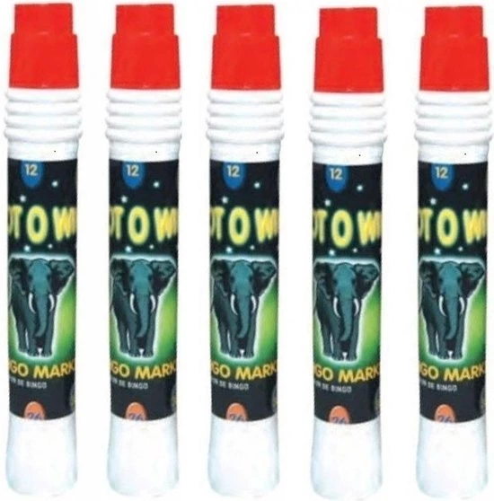 5x Bingo stift rood. 5x Bingo stiften in de kleur rood. Met deze grote bingo stiften zet u snel en makkelijk stippen op de nummers met bingo. Let op: dit is geen speelgoed en niet geschikt voor kinderen.