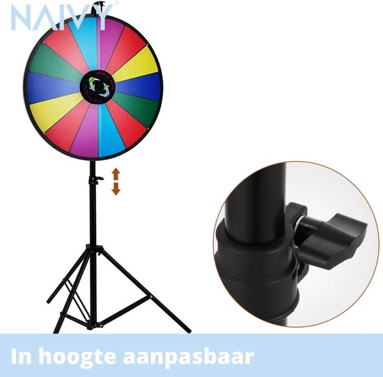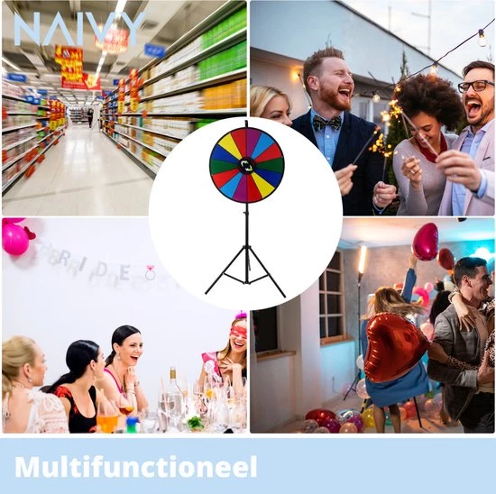 Ben jij opzoek naar een echte gangmaker? Niets maakt een feestje leuker dan het Naivy? Rad van Fortuin waarmee je prijzen kunt winnen of straffen kunt bepalen! Met dit in hoogte verstelbare draairad heb jij voor iedere gelegenheid weer een leuk gezelschapsspelletje gereed.