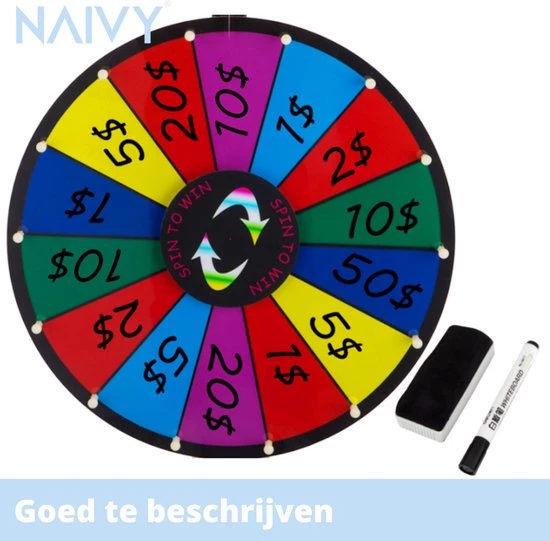 Het draairad van dit rad van fortuin bestaat uit 14 vakken waarop je met de bijgeleverde markeerstiften kunt schrijven. Na gebruik veeg je de teksten net zo eenvoudig weer weg met een wisser. Voor iedere gelegenheid kun je het draairad dus weer voor andere doeleinden gebruiken of er andere prijzen op schrijven. Dit rad van fortuin gaat dus jaren mee!