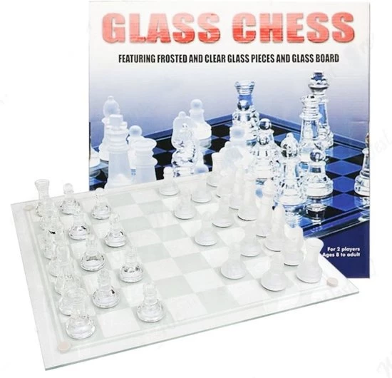 Compleet unieke glazen schaakstukken met glazen schaakbord. Het schaakbord onderscheidt zich door transparante roosters en matroosters (geen zwart-witte roosters), en de kleur van de achtergrond zal de kleur van het bord weergeven; er zijn 4 schokabsorberende pads aan de onderkant van het bord, die schokbestendig en anti-drop is.