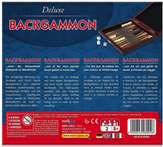 Klassieke spellen; Het populaire klassieke backgammon-spel in reisformaat. De magnetische speelstukken en de hoogwaardige houten kist maken hem bijzonder geschikt voor onderweg! Voor 2 spelers, vanaf 6 jaar, talen: DE / ENG / IT / FRE