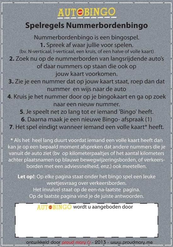 Spelomschrijving: Deze versie speel je met kentekenplaten van auto’s die je onderweg tegenkomt. Spreek af voor welke bingo jullie spelen (B horizontaal, O verticaal, enz.), zoek nu op straat naar nummerborden met nummers die op jouw kaart staan. Als je een zo’n nummer ziet kruis je het door. Net zolang tot iemand bingo heeft. Op elke pagina staat ook weer een meerkeuze vraag over leuke nummerbordweetjes. (De antwoorden kan je weer invullen op de één-na-laatste pagina en de antwoorden zijn te vinden op de laatste.)