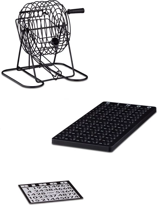 De zwartgelakte bingomolen is uiterst stabiel en door zijn design er net uitziet als de echte bingomolens. 75 ballen, 150 bingo chips, 2 spelborden en 18 bingokaarten maken de set volledig.