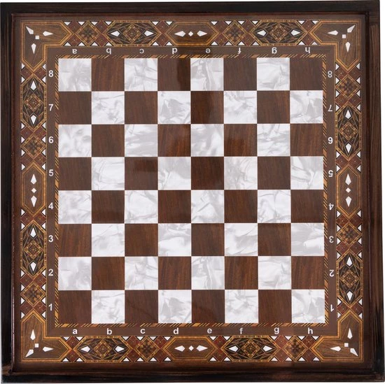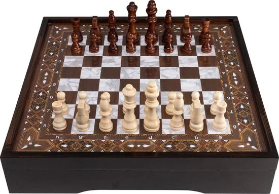 Deze complete schaakset bevat 32 houten schaakstukken. Deze schaakstukken kunnen in de box worden opgeborgen. De binnenkant van de box is met zachte stof bekleed zodat de stukken niet beschadigen. De afmeting van het schaakbord is 40×40 cm. Speelveld is 30×30 cm.
