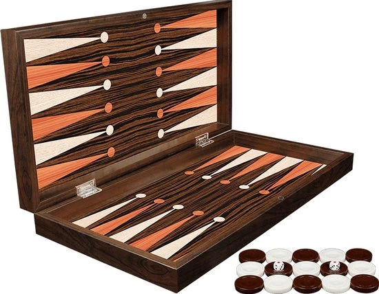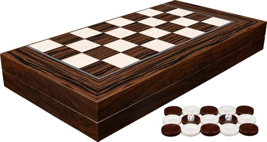 Op de buitenkant van het bord is een 8×8 schaakbord geprint, zodat je ook kunt schaken. Schaakstukken kunnen ook gemakkelijk in de doos worden opgebergd. Schaakstukken worden niet meegeleverd. Voor ??cht dammen is een 10×10 veld nodig. Op een 8×8 bord kun je het spel ook spelen, maar niet volgens de offici??le regels. Er zijn dus 3 spellen te spelen met deze backgammon set.